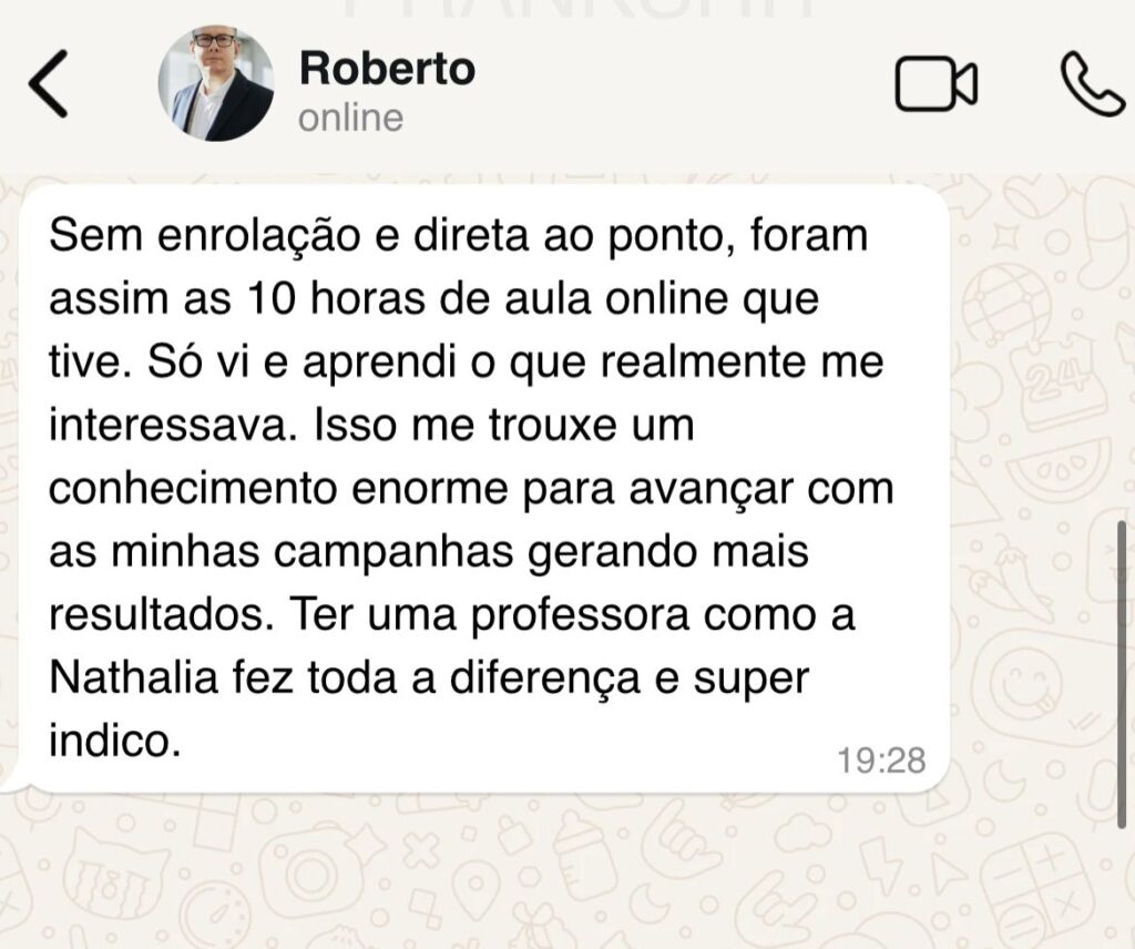 Nas minhas aulas particulares, você aprende sem enrolação, com foco total nas suas metas — seja atrair mais clientes, melhorar suas campanhas ou entender de uma vez por todas como os anúncios realmente funcionam.